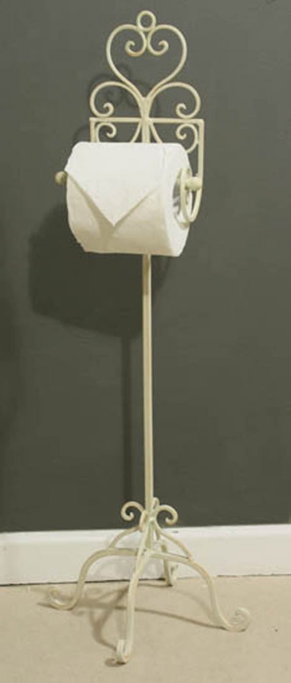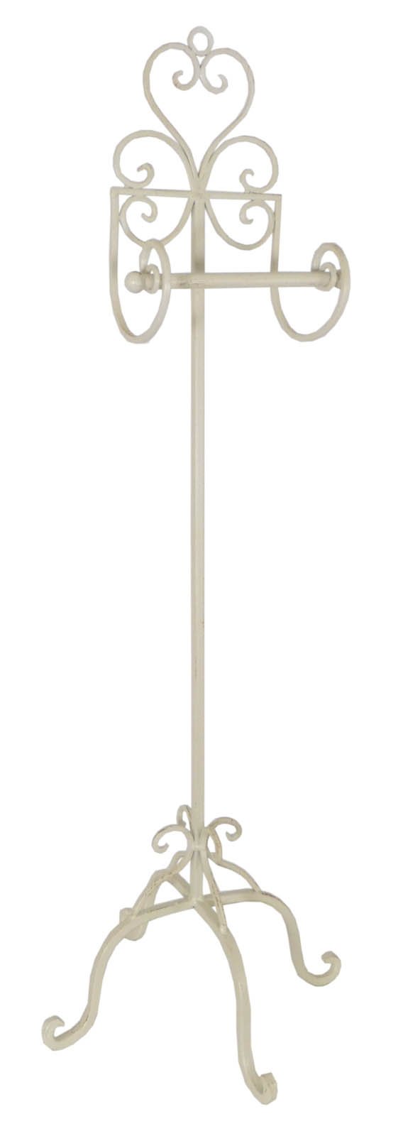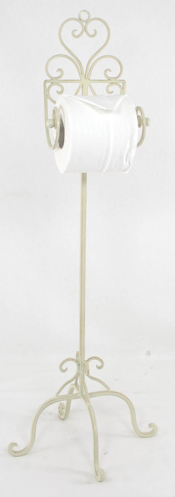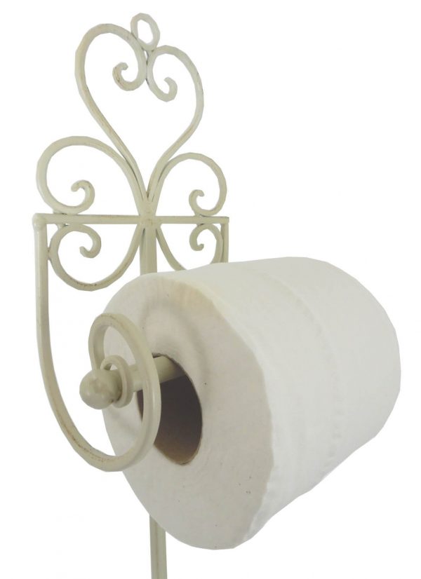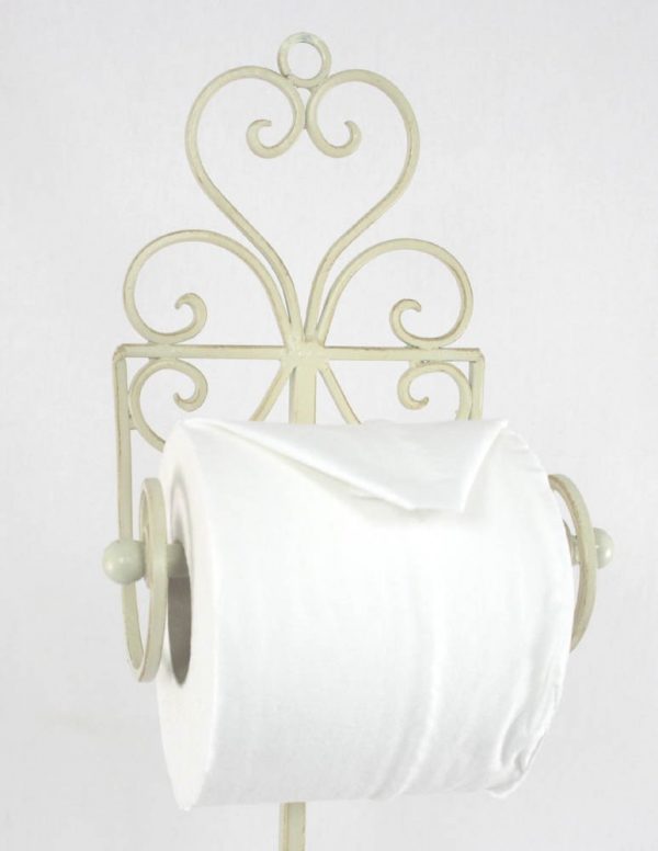 A free standing toilet roll holder. This floor standing toilet roll holder is made from wrought iron, painted with an attractive distressed finish antique cream colour. Featuring a scroll design. This item is distressed painted metal. This means during the manufacturing process slight imperfections have been deliberately created. These give the item an older more “antique” look than it would have if it had been made to be perfect. There may be parts of a design missing, the paint surface may have been deliberately chipped or rubbed down to expose the surface underneath or it may be slightly misshapen. These are meant to give the careworn and well used look of a much older item to a recently manufactured product. This distressed finish is not to be regarded as a fault. Measurements: 26 x 75 x 27cm