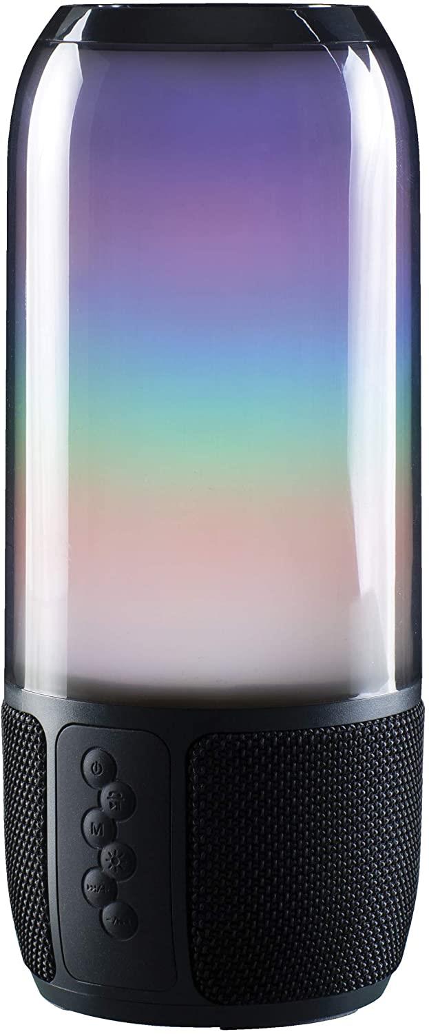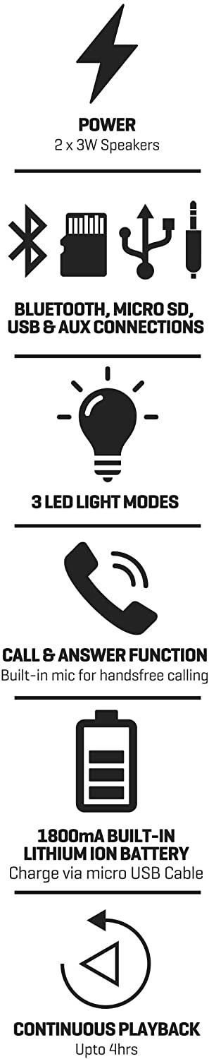 The dual built in 3 watt audio power outputs deliver a crisp, rich and powerful sound. The unit is Bluetooth JL4.2 capable so it can connect to any compatible devices within 10 meters. The bright and shimmering LED light feature will transform any room into a dancefloor. Fully charged, this speaker will play for up to 4 hours which makes it perfect for taking with you on the go, to the park or pool.